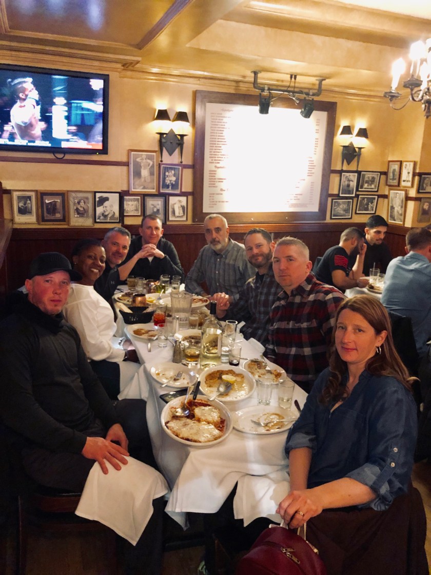 We finally made it back to the hotel where I hit just over 20,000 steps for the day, about 10 miles. I am ready for dinner at Carmines tonight. Made it to dinner. The food was amazing and the company was great. We had a visit from the NYPD bagpipers at dinner.