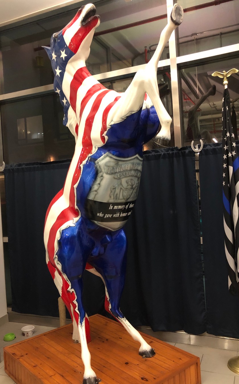 The horse above is symbolic to the unit. The eyes show the fire of the World Trade Center, the horse is rearing up towards evil, and badge on the bottom is for the fallen officers of the mounted unit.