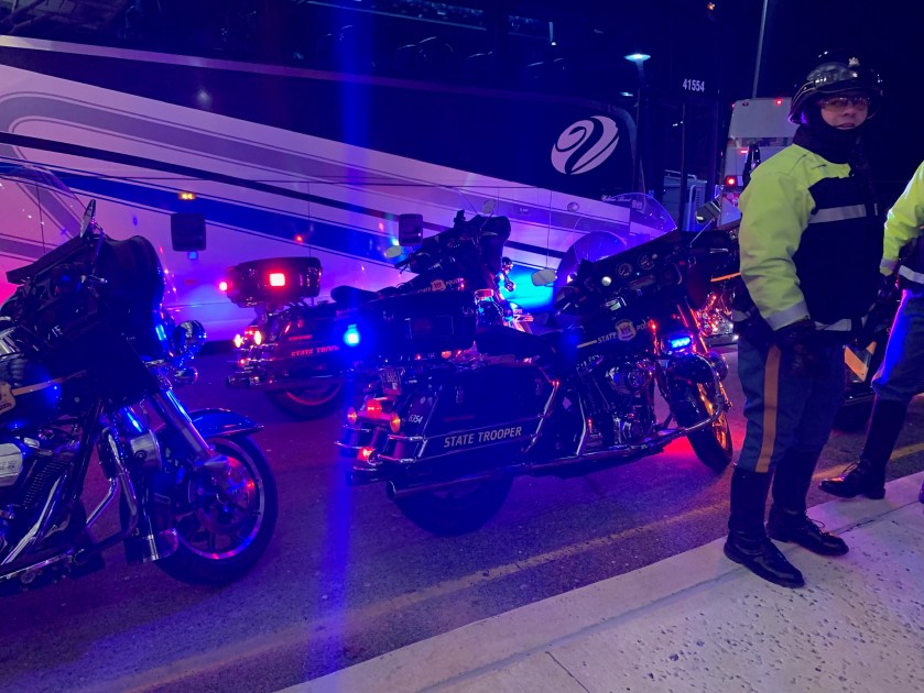 We are loaded up and headed to New York. 4 buses with 185 of us. We are fortunate to have a police escort all the way to New York. We are suppose to arrive by 10pm.