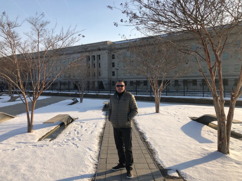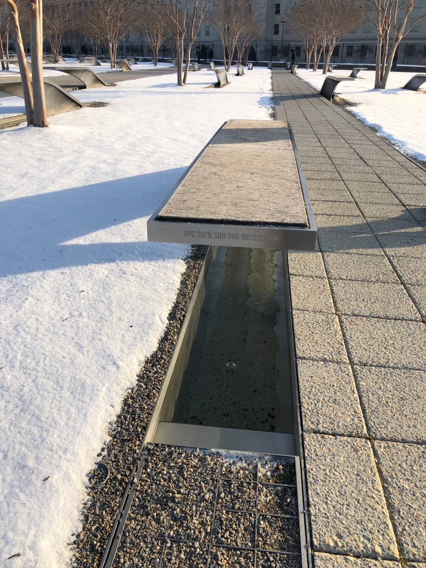 Behind me is where the plane hit the Pentagon. I am standing in the memorial created for all those killed on 9/11. There is a bench and reflection pond below, for each person. The benches are pointed in two different directions. The ones next to me are pointing toward the Pentagon. The names on the benches are those killed in the Pentagon. Benches facing the other direction represent those killed on the plane.