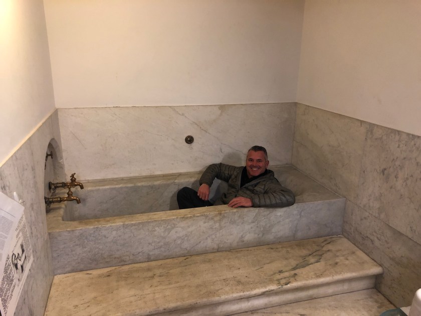 This marble bath tub was built it 1858 and it’s use was discontinued in the 1890’s. This was one of 4 tubs in a bath house that was used by presidents and other politicians. The others have been removed. Couldn’t resist the quick opportunity to sit in it.