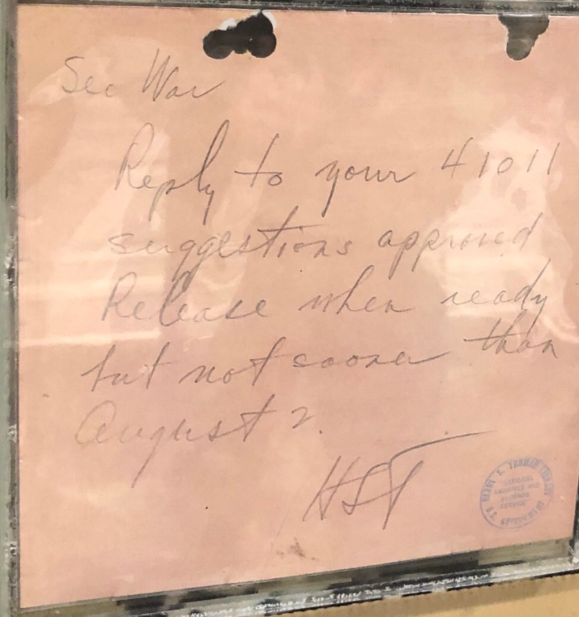 The other interesting item in the tribute room was the handwritten note from President Truman authorizing the use of the atom bomb on Hiroshima.